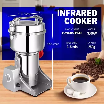Features: Dry Food Grinder Machine can grind dry materials, such as spice, chili, pepper, herb,pearl, nut, peanut,wheat,corn, rice, grain, and so on.The material is more hard, the powder will be more fine. Electric grain grinder motor speed:28000(r/min).Capacity: 200g,Motor Power:148W,Operation time:5mins.Interval time:10mins,Crushed Level: superfine mill; Principle: high-speed grinder. Fitness: 70-300mesh. Widely used for grinding:Whole Grains (soybeans, black rice, corn, etc.);Chinese medicine (ginseng, astragalus etc.); Super hard material:pearl,Polygonum multiflorum and other hard Chinese herbal medicines;Oil materials (sesame, peanut, etc.); With fiber materials(Ganoderma lucidum). The grain crusher made of food-grade stainless steel, tough and durable, no processing pollution,Metal motor blade: wear resistance, ensure the stability and safety of the motor for a long time. When open the cover, the crusher will automatically stop, making the operation safer and more compliance with ergonomics. With overload protection function, when grain mill is in an overloaded/overheat state, the overload protector will pop up automatically to stop grinding for protecting the motor. Specifications: Capacity: 200g Voltage: 110V/220V Power: 1300W Fineness: 70-300 mesh Rotation speed: 2800R/Min Working time: 0-5 min G.W: 3.5 kgs