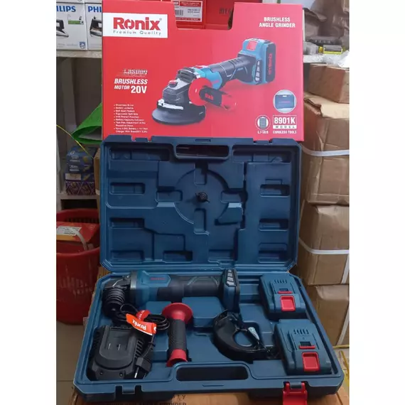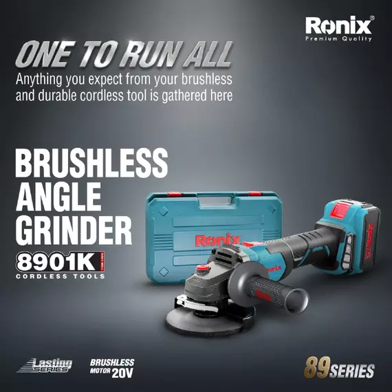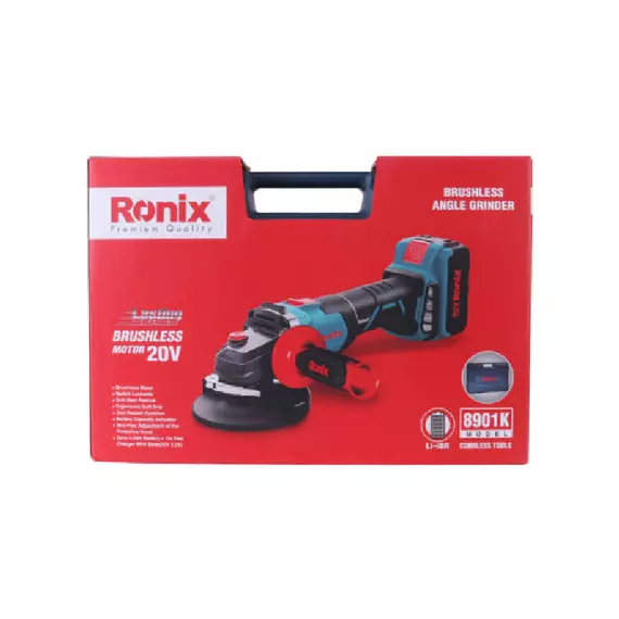 Ronix Brushless Angle Grinder 20V 8901K Angle grinders are a must-have for every toolbox and workplace and they cover a wide range of applications from the trivial to the most demanding ones. Ronix 8901K 115mm Mini Angle Grinder can tackle any task, including rust cleaning, cutting, and grinding with the best quality. The device is equipped with a robust and high-performance motor, which delivers up to 8500 RPM no-load speed. The three positions anti-shock side handle and ergonomically designed and lightweight body of the device maximize the efficiency in cutting and grinding operations in tight spaces and reduce hand fatigue to a minimum. All the members of the long-lasting family are powered with a mutual 20V /4 Ah battery. This product is supplied with two batteries and a fast charger to never leave you in stitches on the job. Features: High performance brushless motor delivers up to 8500 no-load of speed in RPM Light-weight, ergonomic mini angle grinder suitable for precise applications -Soft start switch system that ensures the safety of operation Anti-restart function prevents accidental start-up Direct airflow system which cools the motor for more reliable performance and higher overload capabilities Special slim body design for ideal handling and higher working performance Electronic current limiter for overload protection 2 positions anti-shock ergonomic side handle which promoting easy work and perfect machine control in different range of operator movements -Battery charging indicator lets you know the battery level fast and easy Fast charging system in charger provides optimum performances Specifications: Model: 8901K Battery Voltage: 20V Battery Chemistry: Lithium No-Load Speed: 8500 RPM Wheel Diameter: 115mm Spindle Size: M14 Bore Diameter: 22.23mm Weight: 1.65Kg Supplied In: BMC Includes: Two 4Ah/20V batteries, 1Fast charger
