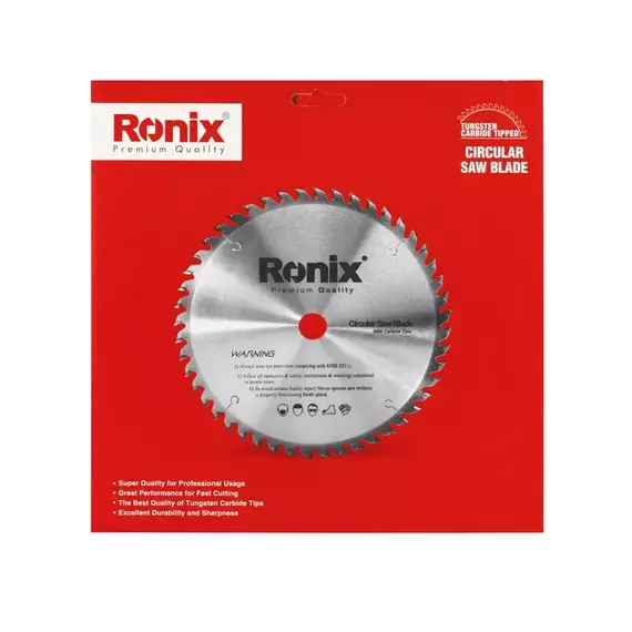 If you have ever experienced cutting with a blunt blade, you know how difficult it is to get a clean cut. Even if not having a clean cut is important to you, it takes a lot of time to cut a piece of wood into two using a dull blade. We at Ronix produce TCT (Tungsten Carbide Tips) blades that are amazing for cutting all kinds of wood and its related products; from plywood to MDF and various laminated boards. With their sharp tungsten carbide tips, these saw accessories provide you with precise cuts. They are produces to have a long life and do not get blunt easily to ensure durable sharpness. Detailed description: What do you think about a wood cutting saw blade that doesn’t get blunt fast and easy? To any handyman at any construction site, this blade sounds dreamy. Well, the Ronix TCT Saw Blade is just that practical accessory that everyone dreams of having. The body of Ronix Tungsten Carbide Tip blades is made of world-class and high-quality steel that delivers accuracy. The steel included in the body of these blades can also resist bending and deflection to provide users with more efficient cutting. The Ronix TCT Saw Blades’ super quality makes it extremely suitable for industrial usages and continuous applications. To cut with maximum precision, Ronix TCT Saw Blades are equipped with sharp tungsten carbide tips. Tungsten Carbide is able to resist high temperatures, and as a result, cutting blades that have tungsten carbide tips can perform better in hot working conditions. Because of their special formulation, cutting wood with these tips will produce less material waste and result in a more optimal cut. To ensure consistent sharpness and guarantee durability, this saw blade is equipped with diamond tips, so that the blade will not get worn-out and dull easily. The unique and professional design of the tips provides great performance and makes the cutting process quicker. The TCG or ATB tooth geometry of these TCT blades delivers accurate cuts in wood, plywood, chip boards, MDF boards and all different types of laminated boards. These cutting wood blades also have extremely narrow kerfs which highly improves the smoothness of the cuts. Because of their narrowness, these kerfs also make the cuts quicker and reduce the time of cutting process which finally results in a more efficient performance. The cutting process normally produces a lot of heat, because a huge amount of friction is involved in the process. To ensure the cutting blade’s durability and its great performance, Ronix TCT Saw Blades are coated with a layer of anti-friction material. This anti-friction cover protects the blade form burning or melting from the heat caused by friction that ultimately delivers faster cutting. To bring faster and cleaner cuts, we at Ronix have equipped the TCT Saw Blades with anti-vibration slots that improves the quality of the cuts. Features Real industry quality level with superior design and Tungsten carbide teeth which provide maximum resistance for longer life providing a high degree of finish edge High-grade carbide blade tips formulated for impact damage resistance Extra-hard steel blade body delivers accuracy and resists bending and deflection for true cuts Unique tooth design provides straight cuts and cutting smoother Supplied in professional color box for high protection during transportation Positive cutting angles produce a smoother cut and allow for a faster feed rate Advanced TCG tooth design: TCG for laminated board, MDF board,... Specification Model: RH-5108 size: 9*64T Wheel Diameter: 230mm Body thickness: 2.2mm Kerf thickness: 3.2mm Arbor Size: 30mm Tooth Design: TCG Number of Teeth: 64 Application For: MDF Hardness (HRC): HRC46+/-2 packaging: color box & color carton