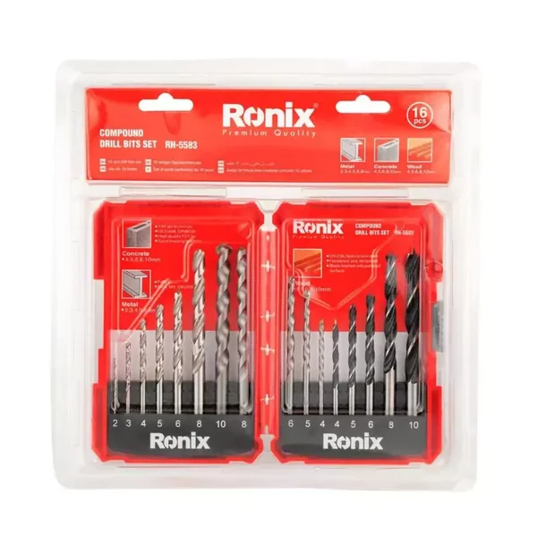 The Ronix RH-5583 Compound Drill Bit Set is a comprehensive 16-piece collection designed to complete any handyman's toolkit. This set provides the essential variety needed to tackle a wide range of projects, from wood and metal to masonry, ensuring you have the right bit for every task.