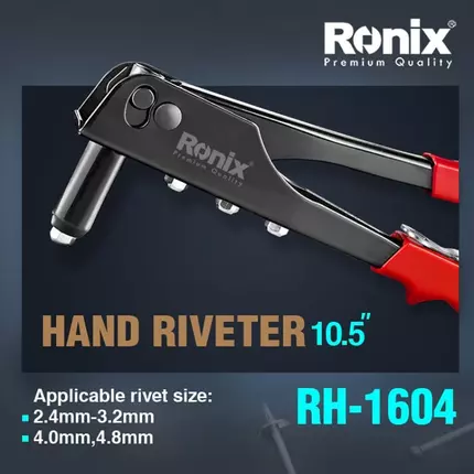 Ronix Hand Riveter 10.5" RH-1604 Look around you, inside and outside, you will see rivets everywhere. Rivets that you’ve never noticed before! Hand riveters are ideal for a large variety of applications including repair and maintenance, roofing and flashing, heating, ventilation, air-conditioning, sheet metal construction, hanger straps, wind guards, even doors and windows are often installed by riveting and, etc. Ronix RH-1604 Hand Riveter has 4 rivets (2.4 to 4.8). This tool with 4 interchangeable nose pieces, is a perfect option to fit a range of rivets. Specifications Designed to work with 2.4 to 4.8 mm rivets for general purpose rivet jobs The rivet system features easy loading and ejection A spring-loaded handle that makes loading rivets simple and a slip resistant grip for precise rivet placement All-steel construction for durability Extended nose makes work easier in hard-to-reach places and a great tool for general purpose rivet tasks, such as gutters, furniture and canvas work High-quality PVC-covered grip makes it anti-slip and provide users with ease and comfort The ergonomic long arm handle design offers enough force to easily rivet the nut without any problem Strong electroplated stamped steel body Heat treated jaws for more long life and more efficiency