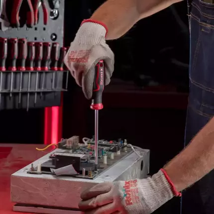 The Ronix RH-2841 screwdriver is designed with durability and user comfort in mind. Its rod is made from high-quality CR-V steel with a matt finish, ensuring long-lasting performance. The hardened tip is highly resistant, providing strength and durability for tough tasks. Thanks to its magnetic head, RH-2841 improves accuracy and ensures a firm grip on slotted screws for enhanced control. This screwdriver has an ergonomic and non-slip handle made of TPR that ensures a comfortable grip and better control during use. The professional handle design balances speed and torque, making it versatile for various fastening jobs. Features The rods manufacured from high quality CR-V steel with matt plating treatment which secures high performance in long-term usage High resistanace hardened tip ensures strength and durability Ergonomic TPR non-slip designed handle for comfortable grip and better control Magnetic head which improves accuracy and comfortable secure grip Ronix professional handle design balances speed and torque in different kinds of fastening. Specification Model: RH-2841 Product: Dimensions 3*100 Drive Type: Philips Rod Material: Chrome Vanadium Steel (CR-V) Tip: Magnetic