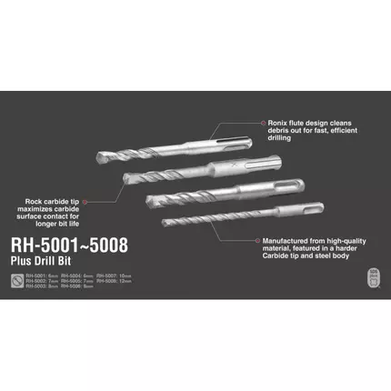 Features: Manufactured from high quality material, featured in a harder Carbide tip and High steel body High temperature brazed tungsten carbide tip for fast accurate and High-Speed Drilling Ronix flute design cleans debris out for fast, efficient drilling Rock carbide tip maximizes carbide surface contact for longer bit life Used for drilling holes in poured concrete and other masonry The robust head is ideal for high impact applications. It allows for precise starts in materials such as reinforced concrete The SDS -Plus shank is suitable for most cordless and electric rotary hammer drills on the market and meets most of functions Specifications: Model: RH-5007 Type: SDS-Plus Diameter: 10mm Total Length: 160mm Working Length: 110mm Tip Material: Tungsten Carbide Body Material: steel