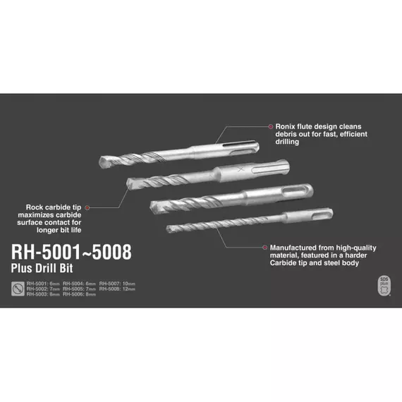 Features: Manufactured from high quality material, featured in a harder Carbide tip and High steel body High temperature brazed tungsten carbide tip for fast accurate and High-Speed Drilling Ronix flute design cleans debris out for fast, efficient drilling Rock carbide tip maximizes carbide surface contact for longer bit life Used for drilling holes in poured concrete and other masonry The robust head is ideal for high impact applications. It allows for precise starts in materials such as reinforced concrete The SDS -Plus shank is suitable for most cordless and electric rotary hammer drills on the market and meets most of functions Specifications: Model: RH-5008 Type: SDS-Plus Diameter: 12mm Total Length: 160mm Working Length: 100mm Tip Material: Tungsten Carbide Body Material: Steel