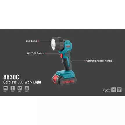Traditional LED flashlights have had many advantages for many years. However, the appearance of new wireless LED torches has revolutionized this type of lighting. Indeed, their power is multiplied and their various features are real assets. But then, what are its advantages? When power cuts occur or when you are simply in the dark, a torch is an ideal alternative to secure your movements. Indeed, the LED bulb integrated into the torch offers much better performance than traditional types and allows real savings thanks to LED technology. Moreover, they do not give off any heat and are more durable over time with more than 50,000 hours of consumption. Ronix 8630C cordless LED torch light offers the best solution in terms of autonomy. This handy tool is rechargeable and can be used for several days for very frequent use. Compared to a traditional torch, its autonomy is 10 times higher. Moreover, its speed and ease of recharging will change your daily life! Features LED work light equipped with high quality 1 pc LEDs which produce 250lm of brightness totally Adjustable head allows easy positioning of the light to various angles Perfect for outdoor work light,camping lights,tent lights, searchlights, patrolling, hunting, hiking, searching, night fishing, garden work Strong body with soft grip rubberized handle When you don't have access to natural or artificial light for various activities, you can use a tool called a torch light. The Ronix 8630C cordless LED torch light is one of the most widely used lighting tools from this brand and provides enough light for your activities. The body of this durable tool is covered with a soft rubber coating so that you can use it more easily. Ronix 8630C, 12V Cordless LED Torch Light: If you are considering purchasing a suitable lighting tool with long life, the Ronix 8630C cordless torch light is our suggestion; because it will be your constant companion in places without access to light, with quality construction, long life, and reliable performance. Read on to learn more about this practical tool. Mechanism: The power source of this professional cordless flashlight is a rechargeable lithium-ion battery. The necessary illumination is provided by a 5-watt LED lamp with a light output of 250 lumens. It also illuminates the desired area up to 100 meters. Correlated Color Temperature (CCT) is essentially a measurement of the yellow or blue color of light emitted by a bulb. The CCT value of this lighting tool is approximately 6500 Kelvin (cool white). Body: The durable body of this tool weighs 400 grams and its dimensions are 73.5 x 119.32 x 207.3 mm; it is covered with a soft rubber coating. The adjustable head of this tool allows easy positioning of the light to various angles. Battery: This tool is equipped with a 20-volt, 2000 mAh lithium-ion battery with a 60-minute charge time, which you can work with for up to 6 hours. This battery can also be used in other Ronix 86 series cordless tools. Ingress Protection: Ingress protection rating, also known as IP rating, is an international standard (IEC 60529) that classifies the degree of protection of the housing material of electrical equipment against solids and liquids, such as dust, rain, and more. The degree of protection of the Ronix 8630C cordless LED torch light is IP54. Accessories and packaging: The Ronix 8630C cordless LED torch light comes in a Ronix-designed color box and includes a 2Ah battery and a fast charger. Specifications: Model: 8630C light type: High brightness LED lamp Power: 5W Battery: 2000mAh/20V Flux: 250lm Illumination Range: >100M CCT: 6500 K Rotation angle: 90° Runtime: 6 h Battery Charging Time: 60 min Degree of protection: IP54 Dimension: 207.3x119.32x73.5mm Weight: 0.4 kg Supplied In: color box