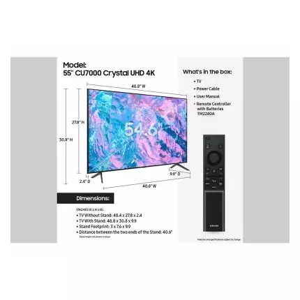Samsung TVs were ranked #1 in Customer Satisfaction, Product Quality, and Service Quality in the 2022 American Customer Satisfaction Index surveys. Technical Specifications: Features : Series: Series 7 Design: Slim Look Color: TITAN GRAY Stand Type: SLIM FEET Bezel Type: 3 Bezel-less Slim Type: Slim look Stand Color: TITAN GRAY Front Color: TITAN GRAY Video : Screen Size: 55 inches Resolution: 3,840 x 2,160 Color: Pur Color HDR (High-Dynamic Range): HDR Picture Processor: Crystal Processor 4K Film Mode: Yes HLG (Hybrid Log Gamma): Yes Contrast: Mega Contrast Contrast Enhancer: Yes HDR10+ Support: Yes Motion Technology: Motion Xcelerator Refresh Rate: 60Hz One Billion Color: Yes Picture Clarity: Yes Filmmaker Mode: Yes Brightness/Color Detection: Brightness Detection Audio : Dolby: MS12 2ch Sound Output (RMS): 20W Speaker Type: 2CH Multiroom Link: Yes Sound: OTS Lite Q-Symphony: Yes Bluetooth Headset Support: Yes Bluetooth Audio: Yes Dual Audio support (Bluetooth): Yes Dolby Decoder: MS12 2ch Object Tracking Sound: OTS Lite Adaptive Sound: Adaptive Sound Buds Auto switch: Yes Eco Features: Eco Sensor: Yes Auto Power Saving: Yes Auto Power Off: Yes Smart Service: Works With AI Speaker: Alexa, Google Assistant TV Plus: Yes Web Browser: Yes SmartThings Hub / Matter Hub / IoT-Sensor Functionality: Yes Samsung Health: Yes Universal Guide: Yes (US only) Media Home: Yes Smart Features: Multi Device Experience: Mobile to TV, TV Sound to Mobile, Sound Mirroring, Wireless TV On Video Communication: Google Meet Tap View: Yes Mobile Camera support: Yes Easy Setup: Yes App Casting: Yes Workspace: Yes Wireless Dex: Yes Web Service: Microsoft 365 Chat Together: Yes (US only) NFT: Nifty Gateway, La Collection, Art Token, Savage ConnecTime: Yes (US only) Telemedicine: HealthTap (US only) Game Feature: Auto Game Mode (ALLM): Yes HGiG: Yes Gaming Hub: Yes (KR, US, CA, BR, GB, FR, DE, IT, ES) Connectivity : HDMI: 3 ports HDMI Audio Return Channel: Yes Anynet (HDMI-CEC): Yes USB: 1 port Ethernet (LAN): 1 port Digital Audio Out (Optical): 1 port RF In (Terrestrial / Cable input / Satellite Input): 1/1(Common Use for Terrestrial)/0 Ex-Link (RS-232C): w/ Dongle Only WiFi: Yes (WiFi5) Bluetooth: Yes (BT5.2) Accessibility : Voice Guide: US English, Mexico Spanish, Canada French, Finnish, German, Greek, Hungarian, Italian, Norwegian, Polish, Portugal Portuguese, Romanian, Slovak, Swedish, Czech, Danish, Dutch, Korean Learn TV Remote / Learn Menu Screen: US English, Mexico Spanish, Canada French Low Vision Support: Zoom Menu and Text, High Contrast, SeeColors, Color Inversion, Grayscale, Picture Off Hearing Impaired Support: Multi-output Audio, Caption Position, Sign Language Zoom, Separate Closed Caption, Sign Language Guide Motor Impaired Support: Slow Button Repeat Dimensions: Product Size (W x H x D) Without Stand: 48.4 "x 27.8" x 2.4" Product Size (W x H x D) With Stand: 48.4" x 30.8" x 9.9" Stand Size (WxHxD): 3" x 7.6" x 9.9" Distance b/w Stand Legs: 40.6" Shipping Size (W x H x D): 54.6" x 33.2" x 6.2" Diagonal Screen Size: 54.6 inches Weight : Product Weight Without Stand: 30.6 lb Product Weight With Stand: 31.3 lb Stand Weight: 0.7 lb Package Weight: 43 lb Power : Power Supply (V): AC110-120V~ 50/60Hz Typical Power Consumption: 62W Maximum Power Consumption: 145W Standby Power Consumption: 0.5W System : DTV Tuner: ATSC/ClearQAM Digital Broadcasting: ATSC/ClearQAM Analog Tuner: Yes Operating System: Tizen™ Smart TV DTV Sound System: Dolby Installation Features: Mini Wall Mount Compatibility: Yes Vesa Wall Mount Compatibility: Yes Accessory : Remote: TM2240A Power Cable: Yes User Manual: Yes E-Manual: Yes Remote Controller Model: TM2240A Remote Controller Model Code: BN59-01388A Batteries (for Remote Control): Yes VESA Wall Mount Support: Yes Zigbee / Thread Module: Dongle Support Full Motion Slim Wall Mount (Y22) Support: Yes SlimFit Cam Support: Support Loading Quantity: 40ft HC: 224 53ft: 462 VESA Standard: Screw Size: M8 Screw depth: 20-22 VESA Spec: 200 x 200