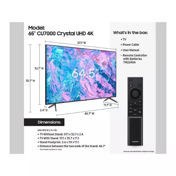 Samsung TVs were ranked #1 in Customer Satisfaction, Product Quality, and Service Quality in the 2022 American Customer Satisfaction Index surveys. Technical Specifications: Features: Multi Device Experience: Mobile to TV, TV Sound to Mobile, Sound Mirroring, Wireless TV On Video Communication: Google Meet Tap View: Yes Mobile Camera support: Yes Easy Setup: Yes App Casting: Yes Workspace: Yes Wireless Dex: Yes Web Service: Microsoft 365 Chat Together: Yes (US only) NFT: Nifty Gateway, La Collection, Art Token, Savage ConnecTime: Yes (US only) Telemedicine: HealthTap (US only) Eco Sensor: Yes SmartThings: Yes Game Feature: Auto Game Mode (ALLM): Yes HGiG: Yes Gaming Hub: Yes (KR, US, CA, BR, GB, FR, DE, IT, ES) Design: Design: Slim Look Stand Type: SLIM FEET Bezel Type: 3 Bezel-less Slim Type: Slim look Stand Color: TITAN GRAY Front Color: TITAN GRAY Product Type: LED Series: 7 Video : Screen Size: 65 inches Resolution: 3,840 x 2,160 Color: Pur Color HDR (High-Dynamic Range): HDR Picture Processor: Crystal Processor 4K Film Mode: Yes HLG (Hybrid Log Gamma): Yes Contrast: Mega Contrast Contrast Enhancer: Yes HDR10+ Support: Yes Picture Engine: Crystal Processor 4K Motion Technology: Motion Xcelerator Refresh Rate: 60Hz One Billion Color: Yes Picture Clarity: Yes Filmmaker Mode: Yes Brightness/Color Detection: Brigtness Detection Audio: Dolby: MS12 2ch Sound Output (RMS): 20W Speaker Type: 2CH Sound: OTS Lite Q-Symphony: Yes Bluetooth Headset Support: Yes Bluetooth Audio: Yes Dual Audio support (Bluetooth): Yes Dolby Decoder: MS12 2ch Object Tracking Sound: OTS Lite Adaptive Sound: Adaptive Sound Buds Auto switch: Yes Accessibility: Voice Guide: US English, Mexico Spanish, Canada French, Finnish, German, Greek, Hungarian, Italian, Norwegian, Polish, Portugal Portuguese, Romanian, Slovak, Swedish, Czech, Danish, Dutch, Korean Learn TV Remote / Learn Menu Screen: US English, Mexico Spanish, Canada French Caption (Subtitle): Yes Embedded POP: Yes EPG: Yes IP Control: Yes OSD Language: English, Spanish, French V-Chip: Yes MBR Support: Yes ConnectShare™: Yes Inputs & Outputs: HDMI Connections: 3 USB: 1 Ethernet (LAN): 1 Terrestrial / RF input: 1/1(Common Use for Terrestrial)/0 Digital Audio Out (Optical): 1 Dimensions : Product Size (W x H x D) Without Stand: 57.1" x 32.7" x 2.4" Product Size (W x H x D) With Stand: 57.1" x 35.7" x 11.1" Stand Size (WxHxD): 2.6" x 7.9" x 11.1" Distance b/w Stand Legs: 46.7" Shipping Size (W x H x D): 63.2" x 37.9" x 7.2" Diagonal Screen Size: 64.5 inches Weight : Product Weight Without Stand: 45.4 lb Product Weight With Stand: 46.1 lb Stand Weight: 0.7 lb Package Weight (lb): 63.1 lb Power : Power Supply (V): AC110-120V~ 50/60Hz Typical Power Consumption: 79W Maximum Power Consumption: 190W Standby Power Consumption: 0.5W System : DTV Tuner: ATSC/ClearQAM Digital Broadcasting: ATSC/ClearQAM Analog Tuner: Yes Operating System: Tizen™ Smart TV DTV Sound System: Dolby Installation Features: Mini Wall Mount Compatibility: Yes Vesa Wall Mount Compatibility: Yes Accessory: Remote: TM2240A Power Cable: Yes User Manual: Yes E-Manual: Yes Remote Controller Model: TM2240A Remote Controller Model Code: BN59-01388A Batteries (for Remote Control): Yes VESA Wall Mount Support: Yes Zigbee / Thread Module: Dongle Support Full Motion Slim Wall Mount (Y22) Support: Yes SlimFit Cam Support: Support Connectivity: HDMI: 3 HDMI Audio Return Channel: Yes Anynet (HDMI-CEC): Yes USB: 1 Ethernet (LAN): 1 Digital Audio Out (Optical): 1 RF In (Terrestrial / Cable input / Satellite Input): 1/1(Common Use for Terrestrial)/0 Ex-Link (RS-232C): w/ Dongle Only WiFi: Yes (WiFi5) Bluetooth: Yes (BT5.2) Smart Service: Works With AI Speaker: Alexa, Google Assistant TV Plus: Yes Web Browser: Yes SmartThings Hub / Matter Hub / IoT-Sensor Funtionality: Yes Samsung Health: Yes Universal Guide: Yes (US only) Media Home: Yes