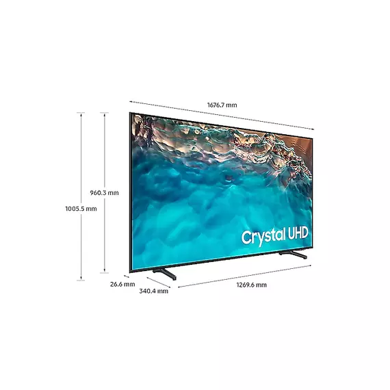 See dark and light in every scene HDR High Dynamic Range increases the range of light levels on your TV so you can enjoy an enormous spectrum of colors and all the visual details, in even the darkest scenes. Lifelike color, born in a pure state with fine crystal Dynamic Crystal Color Immerse yourself in the picture with one billion shades of color. Dynamic Crystal Color delivers lifelike variations so you can see every subtlety. Eliminate clutter Clean Cable Solution Keep your cables tidy and conceal them, reducing clutter and keeping a seamless look for your TV. Sleek and slim, more than ever AirSlim Crystal UHD features an ultra thin profile, allowing your TV to blend effortlessly with your interior for a minimalist look that stands out ever so elegantly. TV and soundbar orchestrated in perfect harmony Q-Symphony Surround yourself with sound from TV and soundbar orchestrated in harmony. Q Symphony uniquely allows TV and soundbar speakers to operate simultaneously for better surround effect without muting TV speakers. Smooth motion for a clear picture Motion Xcelerator Experience clear picture and performance because it automatically estimates and compensates frames for the source of contents. Specification Type: LED Series: 8 Screen Size: 75 " Resolution: 3,840 × 2,160 Video Picture Engine: Crystal Processor 4K Motion Rate: 100 One Billion Color: Yes HDR (High Dynamic Range): HDR PQI (Picture Quality Index): 22 00 HDR 10+: Certified(HDR10+) HLG (Hybrid Log Gamma): Yes Contrast: Mega Contrast Colour; Dynamic Crystal Color Brightness/Colour Detection: Brightness Detection Micro Dimming: UHD Dimming Contrast Enhancer: Yes Auto Motion Plus: Yes Natural Mode Support: Yes Clear Motion: LED Clear Motion Noise Reduction: Yes Film Mode: Yes Audio Dolby Digital Plus: MS12 2ch Adaptive Sound: Adaptive Sound Object Tracking Sound: OTS Lite Q-Symphony: Q-Symphony Sound Output (RMS): 2 0 W Speaker Type: 2CH Bluetooth Audio: Yes Multiroom Li;nk: Yes Smart Service Samsung SMART TV: Smart Operating System: Tizen™ Bixby: US English, UK English, India English, Korean, French, German, Italian, Spanish, BR Portuquese (features vary by language) Far-Field Voice Interaction: Yes Smart Things: Yes Smart View: Yes Smart Feature TV to Mobile - Mirroring: Yes Mobile to TV - Mirroring, DLNA: Yes (requires Android 6.0↑ with Screen Cast capabilities or iPhone iOS 11.4↑ with AirPlay 2 support) Mobile Tap Mirroring: Yes Tap View: Yes (requires Android 8.1↑ with Screen Cast capabilities) Sound Wall: Yes Remote Access: Basic 360 Video Player: Yes WiFi Direct: Yes Sound Mirroring: Yes Game Feature Auto Game Mode (ALLM): Yes Game Motion Plus: Yes Tuner/Broadcasting Digital Broadcasting: DVB-T(T2 Ready) Analog Tuner: Yes Data Broadcasting: HbbTV 2.0.1 TV Key Support: Yes Connectivity HDMI: 3 USB: 2 Composite In (AV): 1 Ethernet (LAN): Yes Digital Audio Out (Optical): 1 RF In (Terrestrial / Cable input): 1/1 Ex-Link ( RS-232C ): 1 HDMI A / Return Ch. Support: Yes eARC: Yes HDMI Quick Switch: Yes Wireless LAN Built-in: Yes (WiFi5) Bluetooth: Yes (BT5.2) Anynet+ (HDMI-CEC): Yes Design Design: AirSlim Bezel Type: 3 Bezel-less Slim Type: Slim look Front Colour: BLACK Stand Type: FLOAT LIFT Additional Feature Instant On: Yes Accessibility: Voice guide(UK English, German, French, Spanish, Italian, Dutch, Polish, Danish, Swedish, Finnish, Norwegian, Portuguese, Russian(only when connecting to Network in EE,LV,LT))/ Enlarge/ High contrast/ Learn TV Remote(UK English, German, French, Spanish, Italian, Dutch, Polish, Danish, Swedish, Finnish, Norwegian, Portuguese, Russian(only when connecting to Network in EE,LV,LT))/ Multi-output Audio One Connect (Jack): One Connect Mini Ultra Clean View: Yes Digital Clean View: Yes Auto Channel Search: Yes Caption (Subtitle): Yes Connect Share™ (HDD): Yes ConnectShare™ (USB 2.0): Yes Embeded POP: Yes EPG: Yes Extended PVR: Yes Game Mode: Yes OSD Language: 27 European Languages + Russian(only for EE,LV,LT) Picture-In-Picture: Yes BT HID Built-in: Yes USB HID Support: Yes Time Shift: Yes MBR Support: Yes Power & Eco Solution Power Supply: AC220-240V 50/60Hz Power Consumption (Max): 225 W Energy Efficiency Class: 5 Eco Sensor: Yes Auto Power Off: Yes Dimension Package Size (WxHxD): 1834 x 1110 x 190 mm Set Size with Stand (WxHxD): 1676.7 x 1005.5 x 340.4 mm Set Size without Stand (WxHxD): 1676.7 x 960.3 x 26.6 mm Weight Package Weight: 42.3 kg Set Weight with Stand: 32 kg Set Weight without Stand: 31 .4 kg Accessory Remote Controller Model: TM2280E Batteries (for Remote Control): Yes Power Cable: Yes