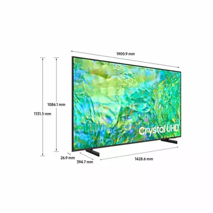 One screen. All the things. With effortless performance, crowd-pleasing features and great value, you can bring home a winner—and feel like a million bucks. Watch your favorite movies and TV shows in captivating 4K resolution as the Crystal Processor automatically transforms every frame. Picture quality is improved as colors, contrast, and motion are analyzed and adjusted as you watch with Dynamic Crystal Color, Contrast Enhancer and Motion Xcelerator Technology. Even your audio is transformed to deliver 3D surround sound that moves with the action using Object Tracking Sound Lite. Vivid crystal color on our slimmest profile Dynamic Crystal Color Lifelike color, born in a pure state with fine crystal Immerse yourself in the picture with one billion shades of color. Dynamic Crystal Color delivers lifelike variations so you can see every subtlety. Smart Hub Discover your favorite content in one place Optimize content curation and discovery, so you spend less time searching and more time streaming movies, games and shows you love. Gaming Experience Solar Cell Remote Specifications: Feature s: Multi Device Experience: Mobile to TV, TV Sound to Mobile, Sound Mirroring, Wireless TV On NFC on TV: N/A Tap View: Yes (requires Android 8.1↑ with Screen Cast capabilities) Video Communication: Google Meet Multi-View: N/A Music Wall: N/A Mobile Camera Support: Yes Easy Setup: Yes App Casting: Yes Ambient Mode: N/A Wireless Dex: Yes Web Service: Microsoft 365 NFT: Nifty Gateway Game Features: Auto Game Mode (ALLM): Yes Game Motion Plus: Yes Dynamic Black EQ: Yes Surround Sound: N/A Super Ultra Wide Game View: Yes MiniMap Zoom: Yes FreeSync: FreeSync Premium Hue Sync: N/A HGiG: Yes Gaming Hub: N/A Specifications : Series: 8 Resolution: 3,840 x 2,160 Connectivity: 3 (4K 120Hz for HDMI 1/2/3) USB: 2 Display : Screen Size: 85 inches Resolution: 3,840 x 2,160 Motion Rate: 200 Video : Picture Engine: Crystal Processor 4K One Billion Colours: Yes AI Upscale: N/A HDR (High Dynamic Range): HDR HDR 10+ Support: Yes HLG (Hybrid Log Gamma): Yes Contrast: Mega Contrast Colour: Dynamic Crystal Colour Viewing Angle: Wide Viewing Angle Brightness/Colour Detection: Brightness Detection Micro Dimming: UHD Dimming Contrast Enhancer: Yes Film Mode: Yes Picture Clarity: Yes Expert Calibration: N/A Smart Calibration: N/A Filmmaker Mode: Yes Audio : Dolby Atmos: N/A Active Voice Amplifier: N/A Adaptive Sound: Adaptive Sound Object Tracking Sound: OTS Lite Q-Symphony: Yes Sound Output (RMS): 20W Speaker Type: 2CH Woofer: N/A Multiroom Link: Yes Bluetooth Audio: Yes Dual Audio Support (Bluetooth): Yes Buds Auto Switch: Yes Smart Service: Operating System: Tizen™ Smart TV Bixby: Yes Far-Field Voice Interaction: N/A Built-in Voice Assistant: Alexa Works with AI Speaker: Alexa, Google Assistant Samsung TV Plus: Yes Web Browser: Yes SmartThings Hub / Matter Hub / IoT-Sensor Functionality: Yes Media Home: Yes Tuner/Broadcasting: Digital Broadcasting: DVB-T(T2 Ready) Analog Tuner: Yes CI (Common Interface): N/A Connectivity : HDMI: 3 (4K 120Hz for HDMI 1/2/3) USB: 2 Component In (Y/Pb/Pr): N/A USB-C (Camera Only): N/A Ethernet (LAN): 1 POGO (SlimFit Cam Only): N/A Audio Out (Mini Jack): N/A Digital Audio Out (Optical): 1 RF In (Terrestrial / Cable input / Satellite input): 1/1(Common Use for Terrestrial)/0 Ex-Link (RS-232C): N/A HDMI Audio Return Channel: eARC/ARC Bluetooth: Yes (BT5.2) Anynet+ (HDMI-CEC): Yes WiFi: Yes (WiFi5) Design : Design: AirSlim Bezel Type: 3 Bezel-less Slim Type: Slim look Front Colour: TITAN GRAY Stand Type: FLAT LIFT Stand Colour: BLACK Additional Features: Auto Rotation: N/A 9:16 Screen Support: N/A Knox Vault: N/A Caption (Subtitle): Yes ConnectShare™: Yes EPG: Yes Extended PVR: N/A OSD Language: Local Languages Picture-In-Picture: N/A Teletext (TTX): Yes One Connect Box: N/A MBR Support: Yes Time Shift: N/A Accessibility : Voice Guide: AU English, China Chinese, Korean, France French, Italian, German, Spain Spanish, Malay Learn TV Remote / Learn Menu Screen: UK English, French, Spanish Low Vision Support: Zoom Menu and Text, High Contrast, SeeColors, Color Inversion, Grayscale, Picture Off Hearing Impaired Support: Multi-output Audio, Sign Language Zoom Motor Impaired Support: Slow Button Repeat Power & Eco Solution: Power Supply: AC220-240V~ 50/60Hz Power Consumption (Max): 310 W Power Consumption (Stand-by): 0.5 W Eco Sensor: Yes Power Consumption (Energy Saving Mode): N/A Energy Efficiency Class: 5 Power Consumption (Typical): 198.0 W Yearly Power Consumption (EU standard): 726 kWh Auto Power Off: Yes Auto Power Saving: Yes Set Dimension (WxHxD): Package Size (WxHxD): 2075 x 1237 x 220 mm Set Size with Stand (WxHxD): 1900.9 x 1131.5 x 394.7 mm Set Size without Stand (WxHxD): 1900.9 x 1086.1 x 26.9 mm Stand (Basic) (WxD): 1428.6 x 394.7 mm Stand (Minimum) (WxD): 1130 x 394.7 mm VESA Spec: 600 x 400 mm Weight : Package Weight: 56.3 kg Net Weight with Stand: 43.5 kg Net Weight without Stand: 41.5 kg Accessory : Remote Controller Model: TM2360E Batteries (for Remote Control): N/A Slim Fit Wall-mount Support: Yes Optional One Connect Cable Support: N/A VESA Wall Mount Support: Yes Auto-Rotation Accessory Support