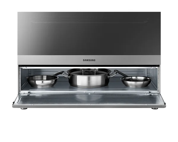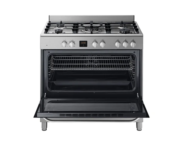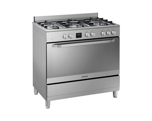 The Samsung NY90T5010SS/FA is a versatile 90cm free-standing cooker featuring a flexible 5-burner gas cooktop and a spacious 95L electric oven. Designed for powerful performance and modern convenience, it combines a high-output Triple Power Burner with a sleek mirror door design and intuitive digital controls for a complete cooking experience.