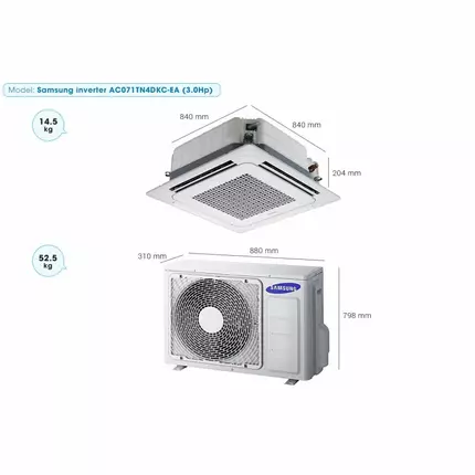 Exquisite, compact design suitable for modern ceilings and interior architectures. Cooling capacity 24000BTU (3.0HP) suitable for area 36 - 40 m². Clean, environmentally friendly refrigerant Gas R410A. Stylish and clean design. Uses Digital Inverter technology to save energy by automatically adjusting the compressor and continuously adapting to the surrounding environment. This superior performance provides comfortable cooling and reduces energy consumption by up to 60%. Intelligent 4-way louver design, disperses strong airflow evenly throughout the room. Users can independently control the four flaps and choose the settings according to their needs for comfort and convenience. Feature Stay cool without direct wind WindFree™ WindFree™Cooling effectively maintains a comfortable level of coolness without the unpleasant feeling of cold wind.Cool air is gently dispersed through 15,672 micro air holes, so you won’t feel too hot or cold. Energy saving with WindFree™ Cooling Energy Saving WindFree™ Cooling allows efficient energy saving up to 55%. Wider cooling range Big Blade Big and optimized blades enable even wider cooling range. Optimized operation by MDS Motion Detect Sensor Motion Detect Sensor enables customized air flow and energy effcient operation. Specification Type: 7.1kW-1Φ-4Way Indoor Unit: AC071TN4DKC/EA Outdoor Unit: AC071TXADKC/EA Mode: COOLING ONLY Cooling [kW]: 2.2 / 7.1 / 8.5 kW Current Input (Nominal) Cooling 1: ) 2.0/10.1/16.0 A Power MCA [A]: 21.5 A MFA [A]: 25.0 A EER (Nominal Cooling): 3.25 Piping Connections Liquid Pipe (Φ, mm): 6.35 mm Liquid Pipe (Φ, inch): 1/4" Gas Pipe (Φ, mm): 15.88 mm Gas Pipe (Φ, inch); 5/8" Installation Max. Length [m]: 50 m Installation Max. Height [m]: 30 m Field Wiring Transmission Cable: 0.75↑ Refrigerant Type: R410A Control Method: EEV Factory Charging (kg): 2 .00 kg Power Supply (Indoor Unit) [Φ, #, V, Hz] 1,2,220-240,50 Fan Type: Turbo Motor (Output) [W]: 65 W Number of Unit (EA): 1 EA Air Flow Rate (High / Mid / Low) [CMM]: 20.8/17.8/14.8 CMM Drain Drain Pipe (Φ,mm): VP25 (OD 32,ID 25) Sound Sound Pressure (High / Mid / Low) [dB(A)]: 40/36/32 dBA External Dimension (Indoor Unit) Net Weight: 14.5 kg Shipping Weight (kg): 17.5 kg Net Dimensions (WxHxD) (mm): 840 x 204 x 840 mm Shipping Dimensions (WxHxD) (mm): 898 x 275 x 898 mm Panel Size Panel model: PC4NUFDAN Panel Net Weight (kg): 6.3 kg Shipping Weight (kg): 8.7 kg Net Dimensions (WxHxD) (mm): 950 x 48 x 950 mm Shipping Dimensions (WxHxD) (mm): 1010 x 117 x 1000 mm Additional Accessories Drain Pump: Built in Drain Pump Max. Lifting Height/Displacement: 750 /24 Power Supply (Outdoor Unit) [Φ, #, V, Hz] 1,2,220-240,50 Compressor Type: Twin BLDC Rotary Model: UG8T265FXAEW Output(kW): 2.32 kW Oil (Type): POE Oil (Initial Charge) [cc]: 7 00 cc Fan (Outdoor Unit) Air Flow Rate (Cooling) [CMM]: 76 CMM Sound (Outdoor Unit) Sound Pressure (Cooling / Heating) [dB(A)]: 50 dBA External Dimension (Outdoor Unit) Net Weight: 52 .5 kg Shipping Weight (kg): 5 6.5 kg Net Dimensions (WxHxD) (mm): 880 x 798 x 310 mm Shipping Dimensions (WxHxD) (mm): 1023 x 881 x 413 mm
