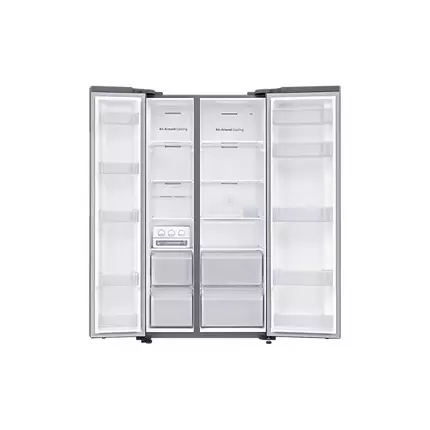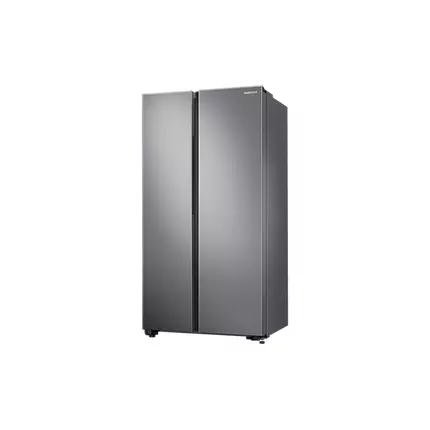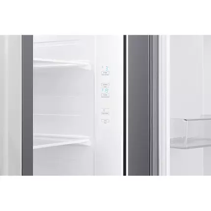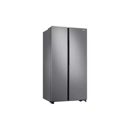The new Samsung Side by Side. By your side. Store more food in a large and more usable space without increasing the external dimensions or compromising energy efficiency. Features & Benefits All Around Cooling Recess Handle Wine Rack Digital Inverter Compressor with 10-year warranty Star Rating: 3.5 Energy H 1780 x W 912 x D 716mm Net Width(mm): 912 Net Case Height with Hinge(mm): 1780 Net Depth with Door Handle(mm): 716 Net Total(Litre): 647 Net Weight(kg): 101 Gross Total(Litre): 655 Model: RS62R5005M9 Capacity Gross Total 655 ℓ Gross Freezer 237 ℓ Gross Fridge 418 ℓ Physical specification Net Width(mm): 912 mm Net Case Height with Hinge(mm):1780 mm Net Case Height without Hinge(mm): 1744 mm Net Depth with Door Handle(mm): 716 mm Net Depth without Door Handle(mm): 716 mm Net Depth without Door(mm): 610 mm Packing Width(mm): 974 mm Packing Height(mm): 1909 mm Packing Depth(mm) :776 mm Net Weight(kg): 101 kg Packing Weight(kg): 108 kg Cooling Feature Power Cool Function: Yes Power Freeze Function: Yes Cooling Type: Mono Cooling Refrigerator Feature Number of Shelves (Total): 4 EA Wine Rack: Yes Number of Door Pocket: 5 EA Egg Container(Egg Tray): Yes Interior LED Light: Yes Number of Vegetable&Fruit Drawers: 2 EA Freezer Feature Ice maker: Manual Twist Number of Drawers: 2 EA General Feature Door Alarm: Yes Refrigerant: R600a Compressor Digital: Inverter Compressor Exterior Feature Display Type: Internal(Ice Blue) Door Handle: Recess Colour: Gentle Silver Matt Performance Noise Level: 40 dBA Climate: Class SN-T Energy Consumption: 480 kWh/year Vacation Mode: Yes Energy Energy Grade: 3.5 Star All Around Cooling Flat Door Design Digital Inverter Large capacity SPACEMAX™ TECHNOLOGY Store more food with a very spacious 655 litre* interior. Its unique SpaceMax™ technology enables the walls to be thinner by using a high-efficiency insulation, creating more storage space without increasing the external dimensions. *Actual product interior may differ from image shown. All-around Cooling Cools your food evenly wherever it is in the fridge. All-around Cooling actively checks the temperature and distributes air evenly from corner to corner. Sleek & seamless design Give your home a stylishly, modern look. Its sleek and seamless design blends into your cabinetry to create a harmonious kitchen interior. It also has beautiful flat doors with recessed handles that don't protrude into your living space. Digital Inverter The Digital Inverter Compressor automatically adjusts its speed in response to cooling demand, which in turn uses less energy, minimises noise and reduces wear and tear for a longer lasting performance. Backed-up by a 20 year warranty* on the compressor. * 20 year warranty is limited to the compressor only. Power Deodoriser The Power Deodoriser is an activated carbon filter which helps to clean the air inside the fridge to help minimise unwanted smells and odour transfer between foods.