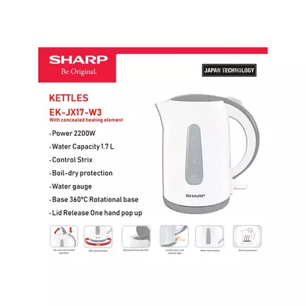 Specifications: Brand: Sharp Model: EK-JK17-W3 Type: Electric Kettle Water Capacity: 1.7 L Power: