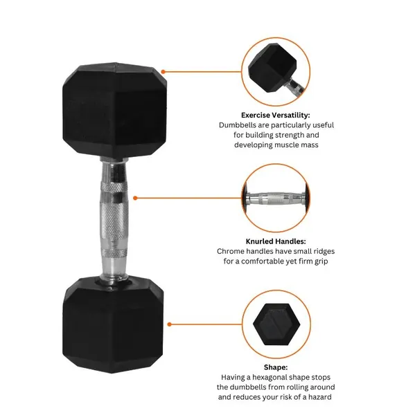 Hexagonal shaped rubber coated dumbbells are an essential part of any home or commercial gym setup. They enable the user to perform a wide variety of exercises, that are considered a staple within most fitness regiments. Unlike rounded dumbbells, the hexagonal shape ensures that the dumbbell will not roll away and exercises such as dumbbell push-ups or renegade rows are just 2 examples of the added benefits over traditional dumbbells.
