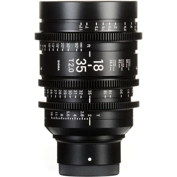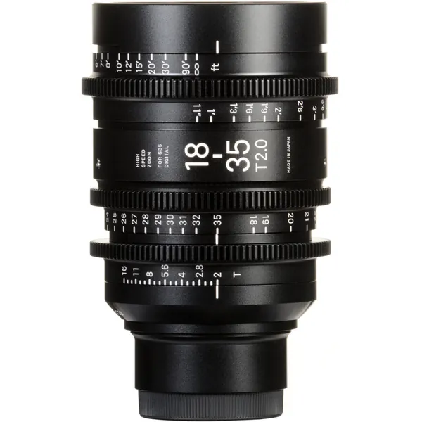 The Sigma 18-35mm T2 Cine High-Speed Zoom Lens with a Canon EF mount and with focus scales marked in feet provides an image circle that covers Super 35mm-sized sensors. It features a maximum T-stop of 2, and the aperture does not ramp over the zoom range. It shares common lens gear positions with the other lens in the Sigma High-Speed Zoom lineup, which makes for rapid lens changes.