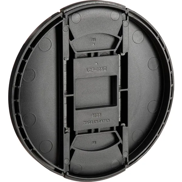 The LCF-105 III from Sigma is a spare or replacement lens cap designed to fit lenses and cameras with a 105mm thread diameter. The lens cap utilizes a center-pinch and side-pinch design. It features a matte black finish with the Sigma logo on the front.