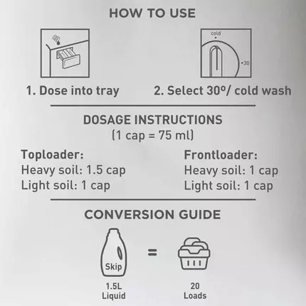 Skip Intelligent Perfect Whites Auto automatic washing liquid has an intelligent formulation that helps prevent white and light fabrics from yellowing or going grey. Fibre Protect™ technology penetrates deep into the fabric, so it cleans in a better and new way, smoothing and aligning fibres so stains and dirt wash away more easily. Washing liquids do not leave a residue and do not clump like washing powder.
