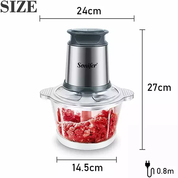 The Sonifer SF-8057 Electric Meat Chopper Grinder is a powerful and convenient kitchen appliance designed for home use. It features a durable stainless steel housing, a large 1.8-liter glass jar, and two speed settings to handle a variety of grinding tasks with ease.