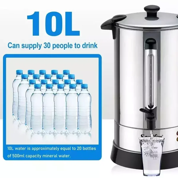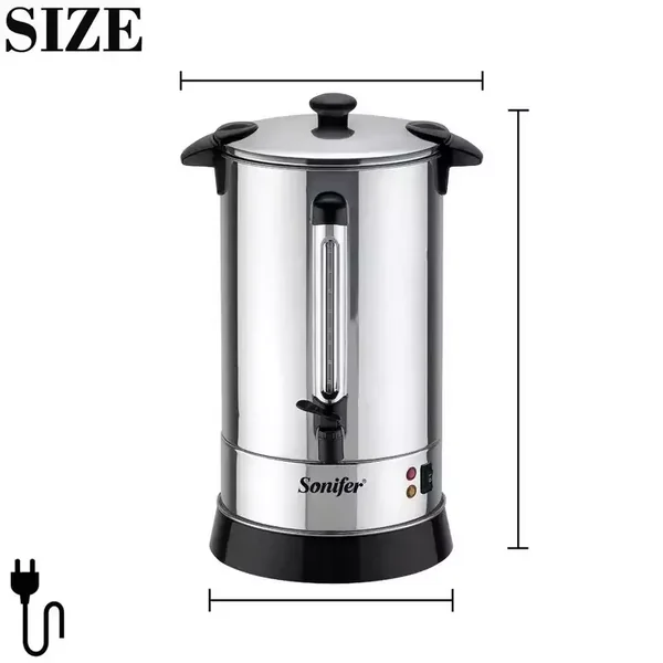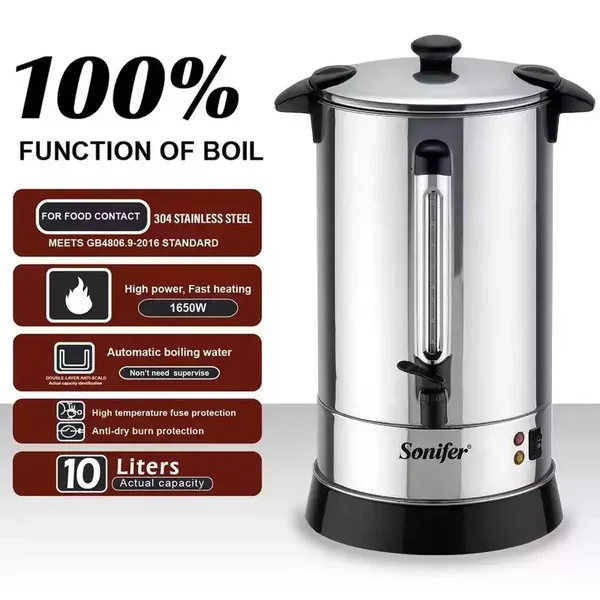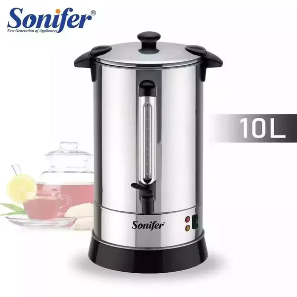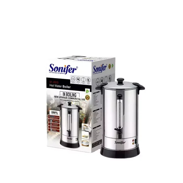 The Sonifer SF-2073 is a high-capacity 10-liter electric hot water boiler designed for household use. Constructed from durable stainless steel and operating at 220V/1650W, it provides efficient boiling with essential safety features like automatic shut-off and boil-dry protection.