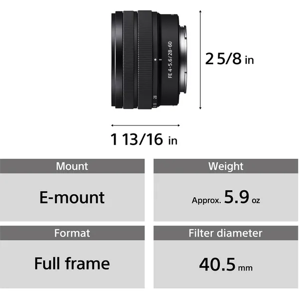 Impressively compact and versatile, the Sony FE 28-60mm f/4-5.6 is a wide-angle to long-normal zoom characterized by its retractable design and sleek profile. Its svelte design makes this lens ideal for walkaround, everyday shooting, and the flexible focal length range benefits a wide range of subject types, from street shooting to portraiture to travel photography.