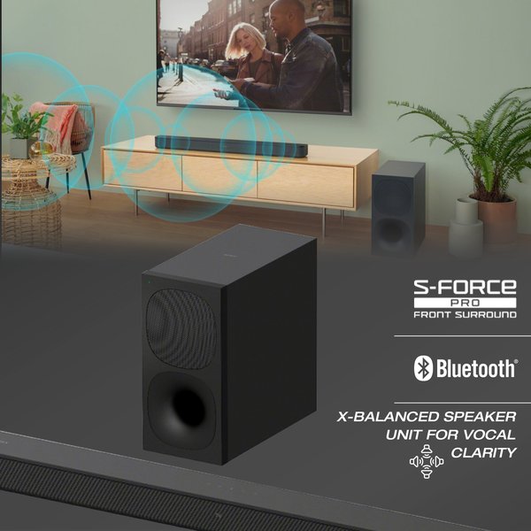 Experience cinematic style surround sound with the Sony HT-S400. S-Force PRO Front Surround and Dolby Digital technologies transport you into the heart of your entertainment. The 2.1ch front surround sound, featuring X-Balanced speakers, ensures crystal-clear dialogue for an immersive audio experience. The wireless subwoofer adds depth to your audio, delivering a richer bass sound.With a powerful 330W total output, this sound system breathes life into your content. Enjoy the convenience of Bluetooth 5.0 connectivity for seamless wireless streaming. The compact remote and OLED display window make operation simple and easy.Say goodbye to cable clutter with flexible layout options and wireless connection. The wall-mountable design with a flat back seamlessly fits flush to the wall, blending style with functionality.