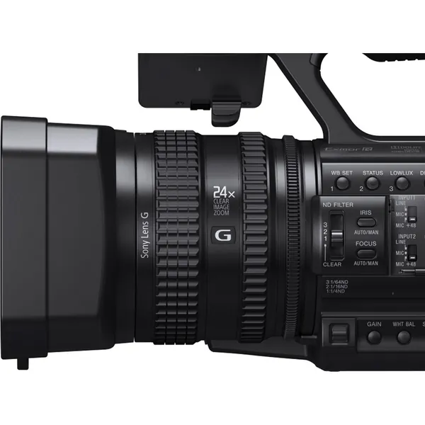 The HXR-NX100 Full HD NXCAM Camcorder from Sony brings high-quality performance, adaptability, and ease of use to a compact, handheld body. The camcorder features a single Exmor R sensor with Full HD 1920 x 1080 resolution, Sony G lens with 12x optical zoom range, and a 24x Clear Image Zoom. The integrated zoom lens features individual lens control rings for focus, iris, and zoom. The lens can be used in either full-auto mode with servo control, or as a completely manually operated lens.