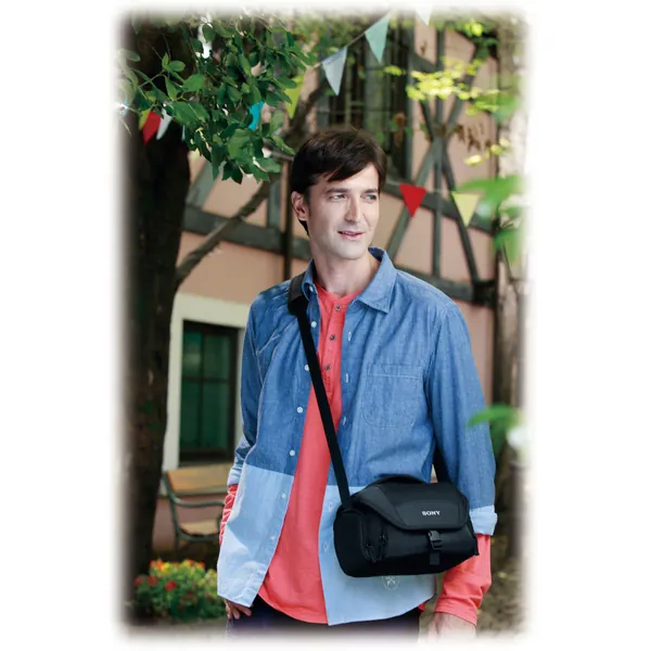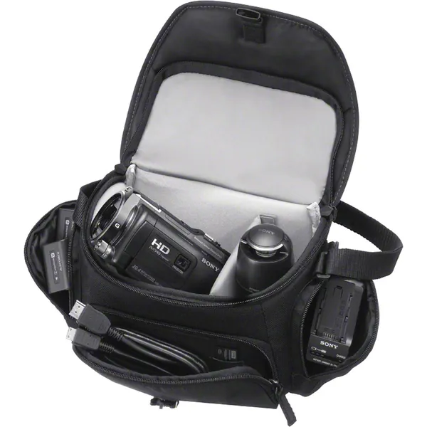 The black LCS-U21 Soft Carrying Case from Sony is a medium-sized case to hold your HD camcorder, Alpha DSLR, NEX or Cyber-shot camera. The case features a movable interior divider that will help you configure your gear to suit your need. Three exterior pouches-two on the side and one in front are provided for storage. The front pocket has a built-in Memory Stick holder.
