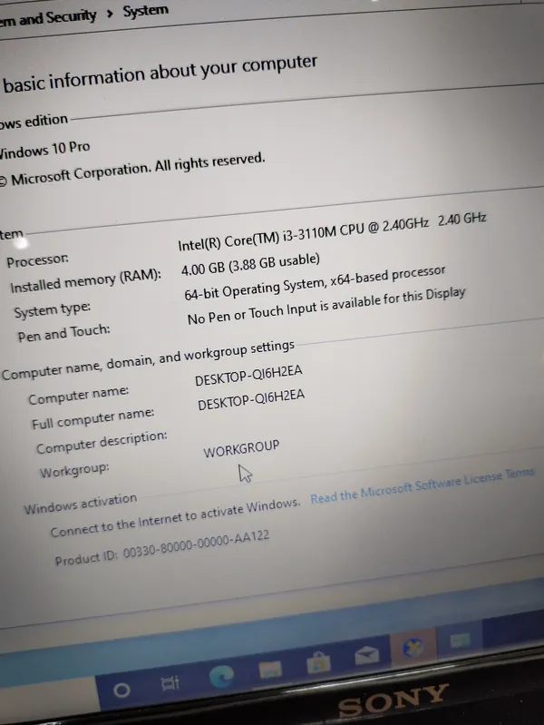 Sony VAIO SVE1512B1EW Core i3 4GB Ram 250GB HDD Windows 10 Pro