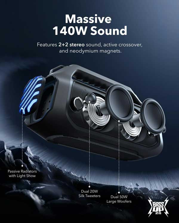 Absolutely blown away by this speaker! The 140W audio with BassUp 2.0 delivers incredible sound, and the 20-hour battery life is a game-changer. It's also completely waterproof and floats, making it perfect for any outdoor fun.