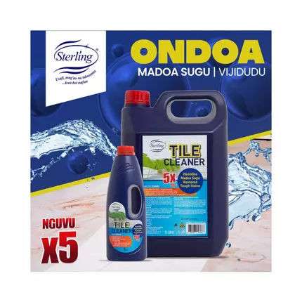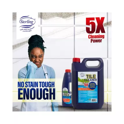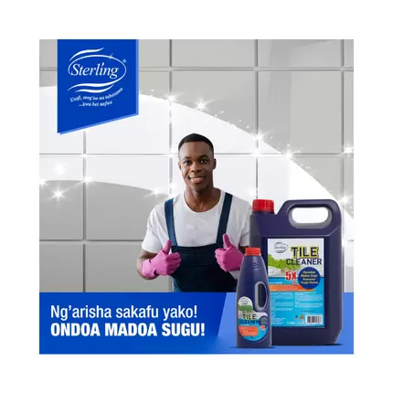 Sterling Tiles Cleaner katika ukubwa wa lita 5 – suluhisho lako la uhakika kwa ajili ya vigae vyako. Imetengenezwa maalum ili kuondoa madoa magumu na kudumisha mwangaza wa vigae vyako, hii dawa inahakikisha uso safi na bila madoa. jipatie Sterling Tiles Cleaner, ufurahie nyuso za vigae vyako zenye na uhakikishe kuwa eneo lako linang'ara na linaonekana zuri daima.
