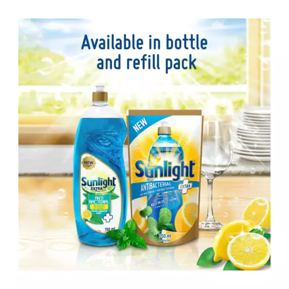 Sunlight Extra Antibacterial dishwashing liquid is inspired by nature. Every drop of Sunlight Extra Antibacterial dishwashing liquid with real lemon juice, mint, and lactic acid degreases and provides 99.9% of germ kill.