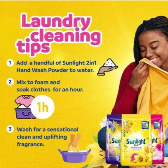 Sunlight powder detergent contains a formula that is tough on stubborn stains and also has a long lasting fragrance that keeps you smelling fresh and clean throughout the day.