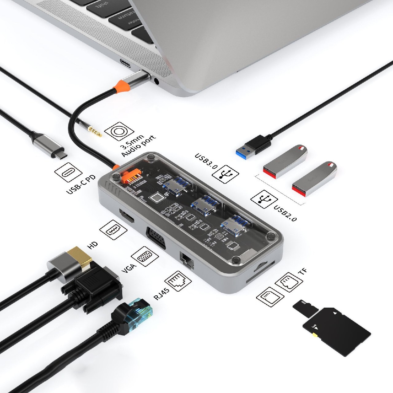 10-Port Multi-Interface Hub: Expand your notebook's capabilities for any occasion.
