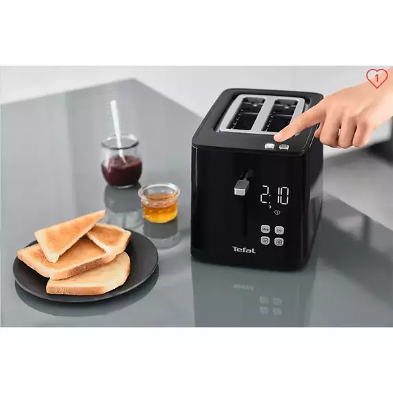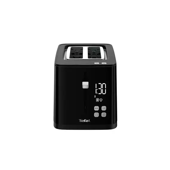 Tefal Toaster: Your Favorite Settings At A Touch Enjoy perfectly browned toast adapted to every taste, with the Tefal Toaster – the modern, intuitive toaster that is as refined as it is forward-thinking. This sleek all-black toaster lets you save your preferred settings so they're just a touch away, ensuring your toast is always how you like it. Featuring a seamless, minimalist digital screen that shows the live countdown of the toasting time, it also offers a range of seven browning levels, from lightly golden to extra crispy – perfect for customized results. Additional convenient features include dedicated Stop, Defrost and Reheat functions with light indicator, variable width slot with automatic bread centering, a removable crumb tray for easy clean-up, and a high-lift lever for facilitated toast removal. Plus, it offers a streamlined aesthetic and intuitive design that is perfect on the countertop of any modern, sophisticated kitchen. Streamline your kitchen with an intuitive, forward-thinking toaster that is as beautiful as it is functional. With the Tefal 2-slice toaster, enjoy bread toasted to perfection – just how you like it, thanks to easy-to-set favorites, a large digital countdown and seven browning levels. With convenient features and a simple yet modern design, delicious toast is just a touch away. Specifications Power - 850 W High-lift - Yes Stop - Yes Defrost - Yes Reheat - Yes Control levels - 7 Centres bread automatically for uniform toasting - Yes Removable crumb tray - Yes Indicator light - Yes Colours - Black