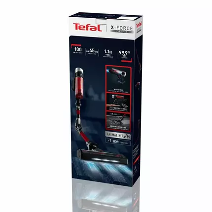 WHAT'S IN THE BOX: Cordless vacuum cleaner, charging base, crevice tool, sofa brush, animal turbo brush, charger, and quick-start guide. HIGH PERFORMANCE: A cordless stick vacuum offering strong constant suction power up to 100 Air Watts* for maximum efficiency over time and a removable battery with a running time up to 45 minutes LONG RUNNING TIME: The 18.5 V removable battery ensures up to 45 minutes** of running time, for deep cleaning with impressive autonomy. ULTRA-LIGHTWEIGHT DESIGN: A slim and compact design for ultra-lightweight cleaning—at just 1.1 kg in handheld mode for total comfort day after day HIGH CAPACITY: The dust container has a high capacity for large-surface cleaning with less emptying, plus easy maintenance with two different ways of emptying, 100% washable SMART & OPTIMIZED CLEANING: A cordless vacuum cleaner enhanced with cutting-edge technology for automatic suction power adjustment by floor type, ensuring optimized cleaning results every time. 15-YEAR REPAIRABILITY: Low-cost parts available in our 6200 repair centers worldwide, for quick repair over many years—part of our commitment to help protect the environment and cut down on waste GO-ANYWHERE CLEANING: Flex tube design reaches deep below furniture for full cleaning without bending over, with the Deep Power LED head for tracking dust in low-light areas and all-floor cleaning. EFFICIENCY AT YOUR FINGERTIPS: A Smart Control Display shows remaining battery runtime and filter cleaning alert, with access to power level and boost trigger ANIMAL CARE ACCESSORIES: Hassle-free cleaning everywhere, not only on floors, with versatile coverage and access into every last corner—ideal for pet owners thanks to a specific animal turbo brush. EXTREME HYGIENE AND FILTRATION: An advanced system that captures 99.9% of fine dust, allergens and dust mites and ensures long-lasting air/dust separation The flexible and lightweight cordless vacuum cleaner for an all-new cleaning X-Perience The X-Force Flex 9.60 Cordless Vacuum Cleaner offers the perfect balance of cleaning performance and comfort. Discover strong constant suction power up to 100 Air Watts for maximum efficiency over time in an ultra-lightweight design—weighing only 1.1 kg in handheld mode. Long-lasting results are assured with 99.9% filtration, intelligent cleaning with automatic suction adjustment by floor type, the flex tube system for effortless cleaning without bending over, an impressive 45-minute battery, and much more. Discover cleaning made effortless—from floor to ceiling. High performance Strong constant suction power up to 100 Air Watts for maximum efficiency over time and a long-lasting battery with running time up to 45 minutes for deep-cleaning performance. Go-anywhere cleaning Discover a new way of vacuuming with incredible ease thanks to a smart design featuring a flex tube to vacuum everywhere without bending over and Power LED vision to track dust in low-light areas Smart and optimized cleaning Exceptional performance enhanced with cutting-edge technology, with automatic suction power adjustment by floor type for optimized cleaning results every time. Ultra-light design A slim and compact cordless vacuum cleaner—at just 1.1 kg in handheld mode—for ultra-lightweight cleaning and total comfort day after day. Animal care accessories Clean everywhere around the house, not only on floors, for versatile coverage with access into every last corner—and the special animal turbo brush to cover the needs of pet owners. Efficiency at your fingertips A Smart Control Display shows remaining battery runtime and filter cleaning alerts—while letting you adapt the power to your needs with 3 different levels and boost trigger. High capacity The dust container has a large capacity for less emptying and easy maintenance.
