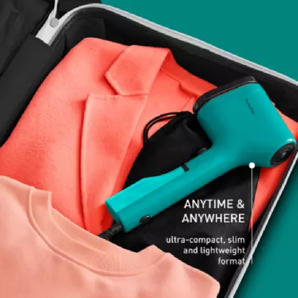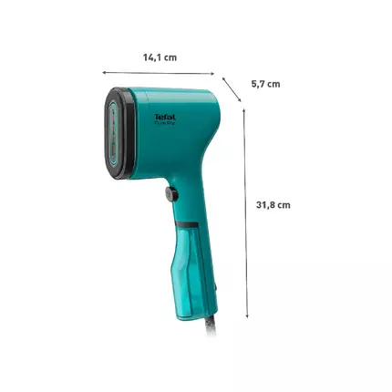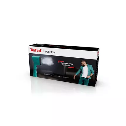 Steam your style, your way. Steam in style on the go with Tefal Pure POP, a range of handheld garment steamers available in a choice of four eye-popping colours*. In teal green with a contemporary slim silhouette, this standout steamer looks sharp – and it’ll make sure you do, too. Light and compact, this little clothes steamer is made for travel. It even has its own pouch. So, you can ensure you’re dressed to impress, wherever you are. Pop it in your bag and you’re good to go – on holiday, on business, or even to the gym. Portable, but punchy, this 1300W Tefal steamer blasts out 20g of steam a minute to show creases who’s boss. Just hang up your clothes and steam away. If you want to go old school, you can use it horizontally to tackle tough areas, like the collar and cuffs. No leaks, no ironing board, no hassle. With its nifty reversible pad system, this handheld steamer is ready for anything. Delicates? Use the gentle velvet side to steam without risk of damage. Dog hair? Switch to the lint removal side and get that outfit looking as good as new. Pure POP is ready to steam in a lightning-fast 15 seconds – because time is precious. Better still, this steamer does two jobs at once, smoothing and sanitising in one stroke. The purifying steam refreshes clothes, reduces odours, and kills up to 99.9% of viruses, bacteria and germs**. All of which means more wearing and less washing. Pure POP is repairable by Tefal for 15 years. Nice one. Key Features: Steam ahead 1300W of power and a 20g/min steam output will make creases disappear in a flash Ready for anything The exclusive reversible pad system lets you tackle everything – from delicates to dog hair All ways Pure POP works vertically or horizontally – no leaks, no ironing board, no hassle Innovative reversible pad system Innovative reversible pad system lets you switch effortlessly between sides, for truly handheld garment care. Good to go Compact and lightweight, this travel-friendly steamer will ensure you’re always dressed to impress Time saving This super-efficient steamer heats up in 15 seconds, and steams and sanitises in one stroke Colour me stylish In teal green, with a slim silhouette, this steamer looks sharp and will make sure you do, too Sanitizing steam power The all-natural purifying power of steam reduces odors, refreshes and sanitizes. Features: Stylish: Steam in style with our sleek, slim green handheld steamer Portable: Look sharp on the go thanks to the travel-friendly design Efficient: Sanitise as you steam and save time with this speedy steamer Versatile: Tackle delicates or dog hair with the reversible pad Convenient: Use it vertically or horizontally, no ironing board needed Specifications: Brand: Tefal Model: DT2024G0/2020G0 Type: Garment Steamer Usage: Vertical Steam output: up to 20 g/min Heat-up time: 15s Water tank capacity: 70 ml Power cord length: 2 m Autonomy: 4 min Power: 1300W Voltage: 220-240V Colour: Till Green Net Dimensions (WxHxD): mm & inches): 103 x 55 x 278mm/4.055 x 2.165 x 10.945 inches Gross Dimensions (WxHxD): mm & inches: 340 x 78 x 161mm/9.449 x 3.071 x 6.338 inches Net weight: 0.769 kg Gross weight: 0.975 kg