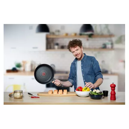 TEFAL UNLIMITED FRYPAN 32 CM The best anti-scratch non-stick coating* *Compared to Tefal's other non-stick coatings. Internal abrasion test. The unmistakable sizzle of chicken tossed into the pan, the clatter of utensils, the quick slide of a spatula at just the right moment... Extreme cooking calls for a frying pan that can withstand extreme conditions. Bringing together the all-new TITANIUM ANTI-SCRATCH coating offering outstanding non-stick durability that can withstand even metal utensils—with an extra-thick THERMO-FUSION™ + base, the Tefal Unlimited frypan takes cooking performance to a whole new level. Description Product Family FRYPAN Diameter 32 CM Material ALUMINIUM Hobs compatibility INDUCTION - GAS - ELECTRIC - CERAMIC - HALOGEN Oven compatibility YES, UP TO 175°C Dishwasher safe YES Inside Coating Name TITANIUM Inside Coating/finish NON-STICK COATING Heat Indicator YES Outside coating/finish NON-STICK COATING Outside coating color BLACK Pouring Edge YES Handle type Fixed Bottom type INDUCTION TECHNOLOGY Coating Characteristic PFOA Free Cooking surface Non stick Cooking style Inspiring cooking Coating durability (for Pans) X6 Product Specificity Specific shape Diameter cm / Nb of people (for Pans) 30 cm / 8-10 people Removable handle No Essentials The best anti-scratch non-stick coating* *Compared to Tefal's other non-stick coatings. Internal abrasion test. Discover TITANIUM ANTI-SCRATCH : The best anti-scratch non-stick coating*, boasting new engineering with maximum resistance that lasts up to 6 times longer compared to Tefal Titanium standard coating. * Compared to Tefal's other non-stick coatings, internal abrasion test 100% safe non-stick coating 0% PFOA, 0% lead, 0% cadmium* * Stricter controls than those required by current food contact regulations. No lead no cadmium (no Pb no Cd) means no intentional addition of Pb and Cd in the coatings. No migration at a level of 0.005 mg/kg. THERMO-SIGNAL™ THERMO-SIGNAL™ technology indicates the ideal starting cooking temperature to guarantee perfect texture, color and taste for delicious full-flavored meals every day. THERMO-FUSION™+ Thanks to its extra large grid combined with a thick base, Thermo-Fusion™+ guarantees fast heating and uniform heat distribution throughout the pan, for evenly cooked food prepared to perfection.