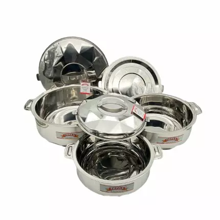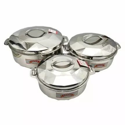 Sizes 4000ml 6000ml 8000ml Description Comes 3 Pieces Material : Stainless Steel This casserole is perfect for providing your Guests with hot Food each and every time Easy to clean,easy to fill,leak proof ,food grade, hot and cold capacity