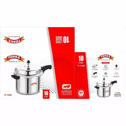 Brand Topaz Capacity 10 litres Material Aluminium Closure Type Outer Lid Colour Silver Finish Type Aluminium Special Feature Gas Stovetop Compatible Control Method Touch Made From High Grade Virgin Alluminium Conforming Ergonomic User Friendly Handle Nitrile Gasket Conforming To food grade Standard Gasket Release System Precision System Precision Weight Valve Mettalic Safety Plug