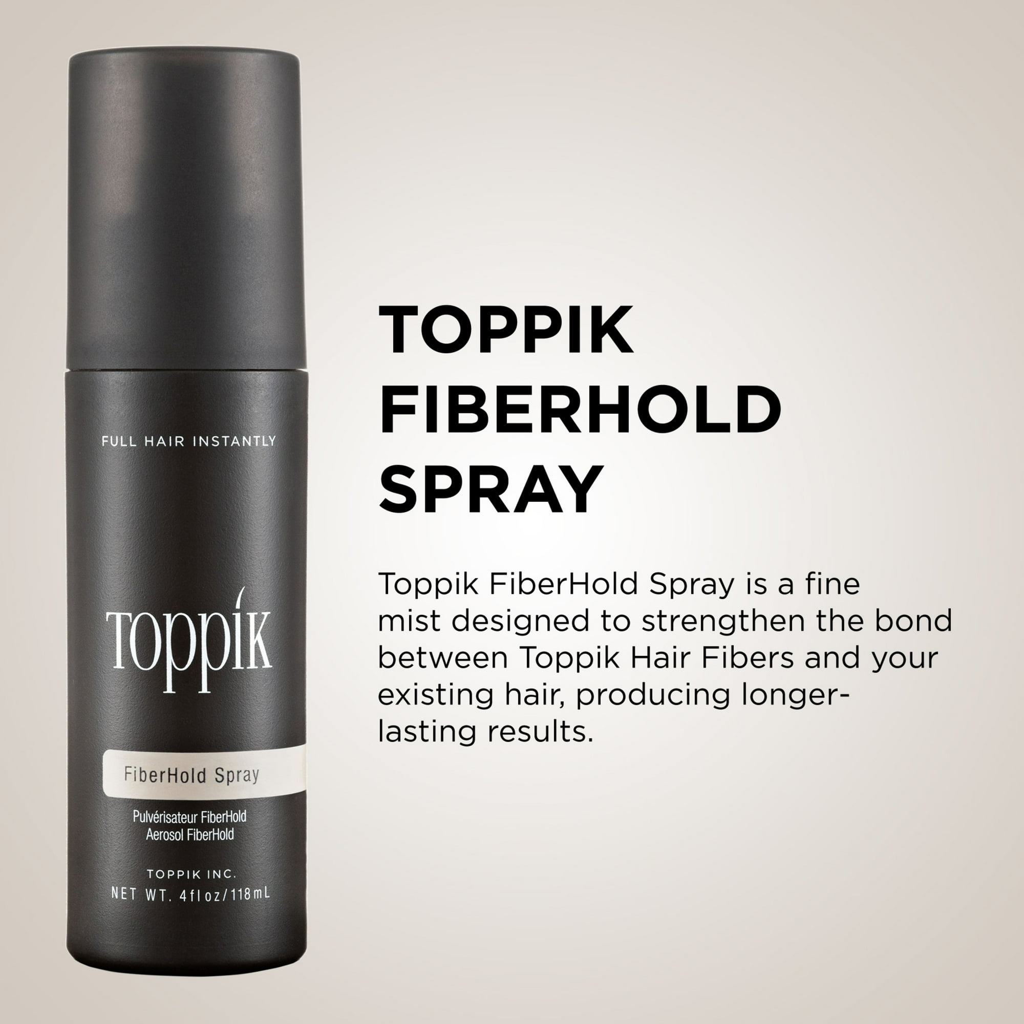 Toppik FiberHold Spray is a fine mist designed to strengthen the bond between Toppik Hair Fibers and your existing hair, producing longer-lasting results and making your hair shine. There are countless reasons to use Toppik hair thickening and hair care products, and this hair fiber holding spray is no exception. Don’t let thinning hair knock your confidence. This easy-to-use hair fiber spray will keep your hair looking beautiful by intensifying the hold between hair fibers and your natural hair while adding beautiful, natural-looking shine. Toppik FiberHold hair fibers spray also helps hair fibers resist wind, rain, and perspiration for long-lasting results in all conditions. You no longer need to worry about your hair product staying in place. Toppik Fiber Hold Spray is the perfect finishing step after applying and styling hair fibers. Simply apply this hair spray mist in short, light sprays and reapply as needed. This hair care for women and men dries quickly, leaving your hair set and ready for the day. Toppik has a long history and is trusted by both professional stylists and users. The results have changed the hair industry, and have been touted as must-have hair products for decades.