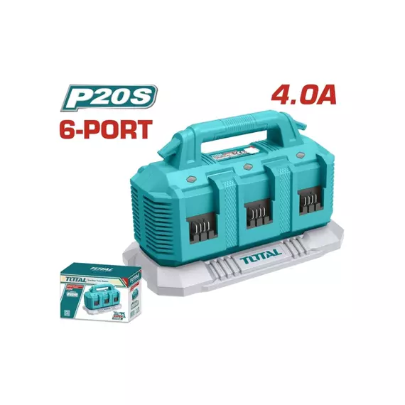 Specifications: Brand: Total Model: TFCLI2064 Type: Battery Charger Input voltage: 220-240V~50/60Hz Output voltage: 20V Output current: 4A Accepts up to 6 P20S battery packs Sequentially charges batteries Packed by color box Fits all Total P20S 20V tools Charges 6 batteries sequentially, 1 battery at a time 4000mA: for two 2.0Ah in 30 mins, or two 4.0Ah batteries in 1 hour