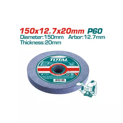Specifications: Brand: Total Model: TAC1506027 Type: Grinding Stone Abrasive wheel size: 150x12.7x20mm Diameter: 150mm Arbor: 12.7mm Thickness: 20mm Abrasive wheel grit: 60 grit For item: TBG15015 Packed by label