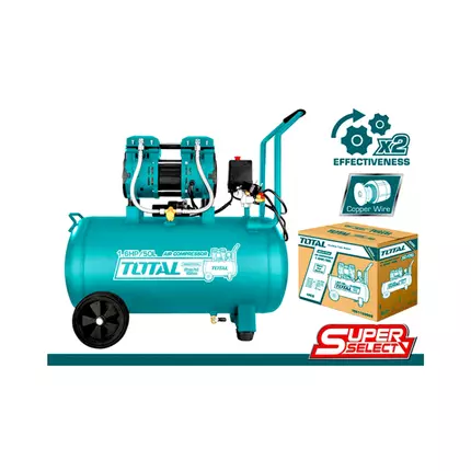 The air compressor TOTAL TCS1120508 has high efficiency thanks to the electric motor. The robust case is suitable for any conditions of use. The presence of wheels and a transport handle ensure mobility, suitable for construction sites or industrial areas. The built-in pressure gauge makes it easy to measure the air compression ratio and reduces the chance of broken tool connected. Features: Oil-Free System Low Noise Operation Durable Copper Wire Motor Compact Design Easy to Transport Specifications: Brand: Total Model: TCS1120508-8 Color: Blue Power Source: Corded Voltage: 220-240V Watts: 1200W (1.6HP) Tank Capacity: 50L (13.2gal) Noise Level: 75dB Motor Type: Copper wire No-load Speed: 2850RPM Operation Pressure: Maximum 8 bar Packaging: Packed by carton box Additional Information: Weight: 29.50 kg Dimensions: 60 × 56 × 68 cm