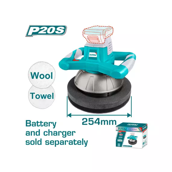 Specifications: Brand: Total Model: TOPLI2001 Type: Angle Polisher Voltage: 20V No-load speed: 2500rpm Polishing disc diameter: 254mm Eccentric distance: 5mm With 1 pcs wool polishing bonnet With 1 pcs towel polishing bonnet Battery and charger sold separately Packed by color box