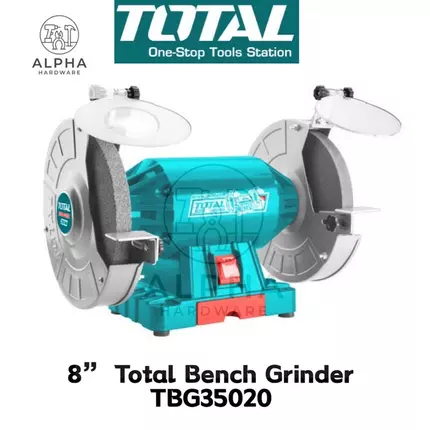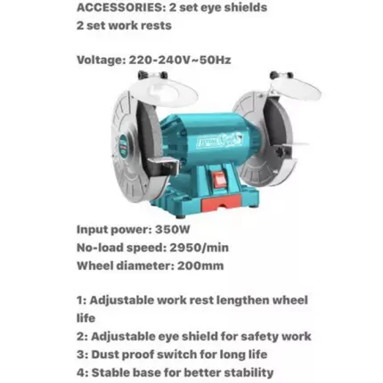 Product Description 8” BENCH GRINDER TOTAL 350W ALUMINIUM BASE TBG35020 Voltage: 220-240V~50Hz Input power: 350W No-load speed: 2950RPM Wheel diameter: 200mm(8″) Heavy Duty Aluminium Base Adjustable work rest Including 1 set eye shield 1pcs tool storage box Packed by carton box Features 1: Adjustable work-rest lengthen wheel life 2: Adjustable eye shield for safety work 3: Dustproof switch for long life 4: Stable base for better stability