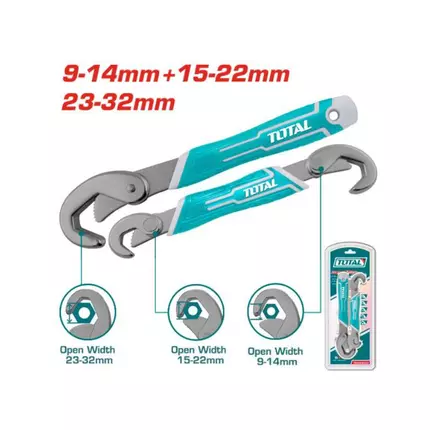 Specifications: Brand: Total Model: TBWS09328 Type: Bent Wrench 1 Pcs double open end wrench, 9-14mm,15-22mm 1 Pcs single open end wrench, 23-32mm Chrome plated Two color handle Packed by sliding card