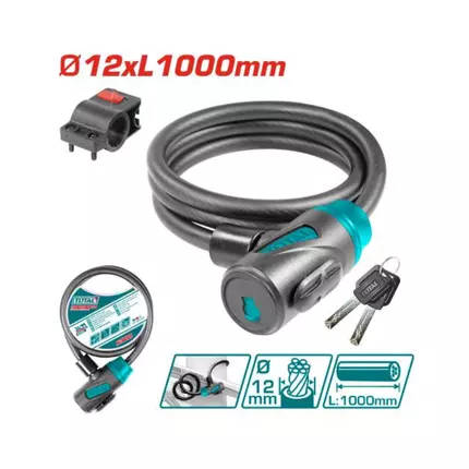 Specifications: Brand: Total Model: TBK11210 Type: Padlock Size: 12X1000mm PVC coated braided High quality wire rope Padlock rack for bicycle frame Can be rolled up for easy storage With 2 pcs brass keys Packed by paper card