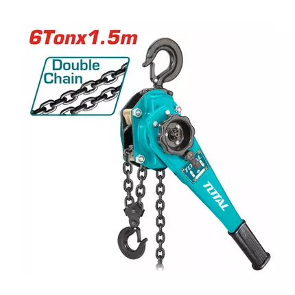 Specifications: Brand: Total Model: THSLB6001 Type: 6 Ton Chain Block Rating Lifting Weight: 6 Ton Lifting Height: 1.5m Strands of Load Chain: 2 Minimum Distance Between Two Hooks: 600 mm Pulling Force at Full Load: 340 N Net Weight: 26kg Packaging: Wooden Case