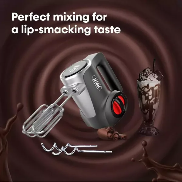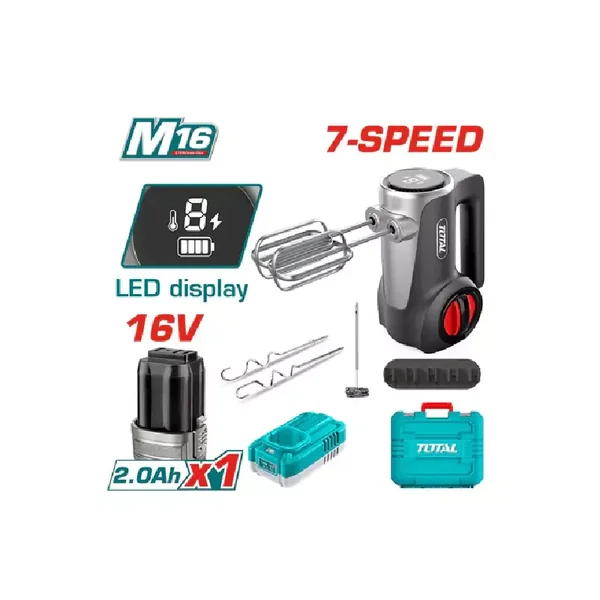 The Total Cordless Hand Mixer TMK023K is a versatile and portable kitchen tool, powered by a 16V lithium-ion battery. With 7-speed control, an LED display, and a convenient eject button, it offers cord-free convenience for whipping, mixing, and frothing.