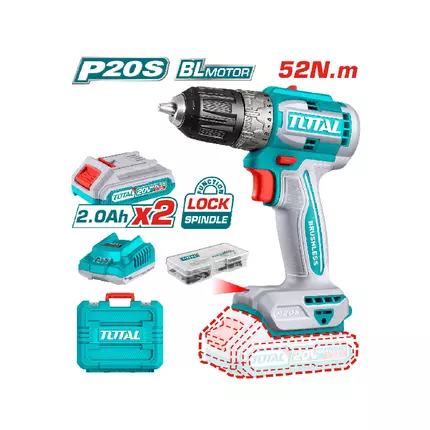 Total Cordless Impact Drill 52Nm Lithium-ion 20V with Brushless Motor, 47pcs Accessories, 2pcs 2.0Ah Battery, 1pc Charger TDLI20453